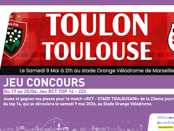 Extrait règlement : Jeu exclusivement réservé aux clients du réseau Mistral valable du 17 au 20/04 inclus. A gagner, 20 lots de 2 invitations sur la page Facebook réseau Mistral pour assister au match de la 23e journée du top 14 qui se déroulera le samedi 9 mai au stade Orange Vélodrome. Les 20 gagnants seront tirés au sort parmi les bonnes réponses et contactés à partir du 21 avril 2026. Pendant la période du jeu, les gagnants ne pourront remporter qu'un seul lot d'une valeur de 90€/lot de 2 places. Pour valider le lot remporté, les gagnants devront nous envoyer impérativement leurs coordonnées précises et exactes par courrier.