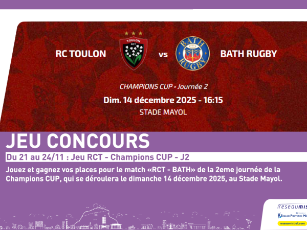 Extrait règlement : Jeu exclusivement réservé aux clients du réseau Mistral valable du 21 au 24/11 inclus. A gagner, 15 lots de 2 invitations sur la page Facebook réseau Mistral pour assister au match de la 2e journée de la Champions CUP qui se déroulera le dimanche 14 décembre au stade Mayol. Les 15 gagnants seront tirés au sort parmi les bonnes réponses et contactés à partir du 25 novembre 2025. Pendant la période du jeu, les gagnants ne pourront remporter qu'un seul lot d'une valeur de 90€/lot de 2 places. Pour valider le lot remporté, les gagnants devront nous envoyer impérativement leurs coordonnées précises et exactes par courrier.
