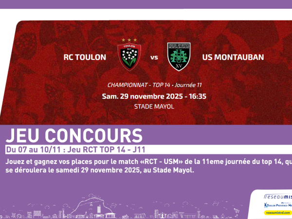 Extrait règlement : Jeu exclusivement réservé aux clients du réseau Mistral valable du 07 au 10/11 inclus. A gagner, 15 lots de 2 invitations sur la page Facebook réseau Mistral pour assister au match de la 9eme journée du top 14 du RCT qui se déroulera le samedi 29 novembre au stade Mayol. Les 15 gagnants seront tirés au sort parmi les bonnes réponses et contactés à partir du 12 novembre 2025. Pendant la période du jeu, les gagnants ne pourront remporter qu'un seul lot d'une valeur de 90€/lot de 2 places. Pour valider le lot remporté, les gagnants devront nous envoyer impérativement leurs coordonnées précises et exactes par courrier.
